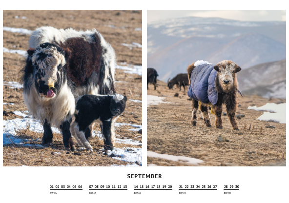Our wall calendar provides you with pictures of fluffy animals from the Mongolian steppe throughout the year. We took the photos ourselves during our visits.