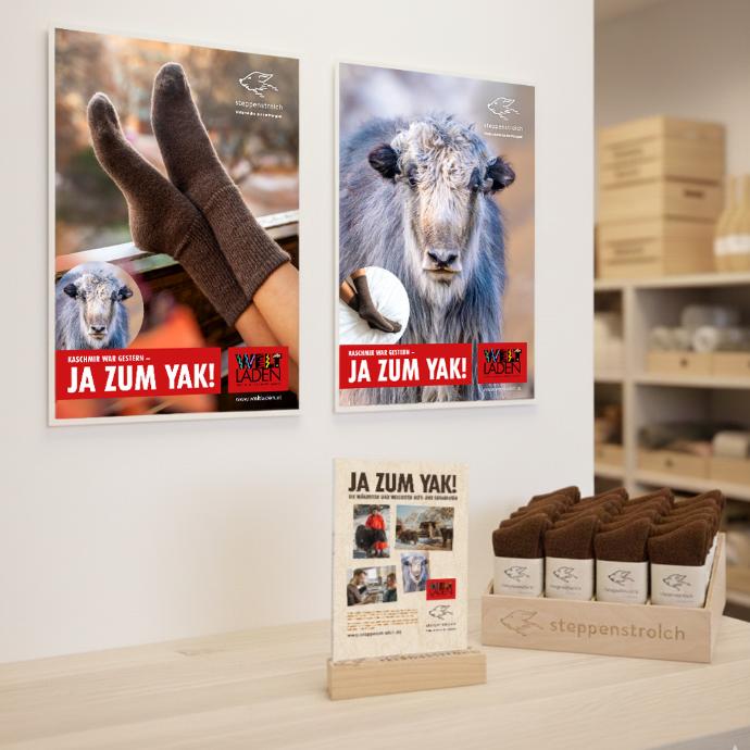 Set mit zwei A1 Postern (Sockenmotiv und Yakmotiv) + 1 Tischaufsteller